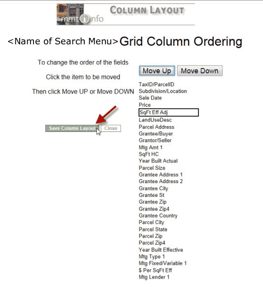 You can rearrange the order in which data columns appear in Grid-View by selecting a column header and clicking on the Move Up or Move Down button. To keep your changes select Save Column Layout. To exit without keeping the changes, select Close. |