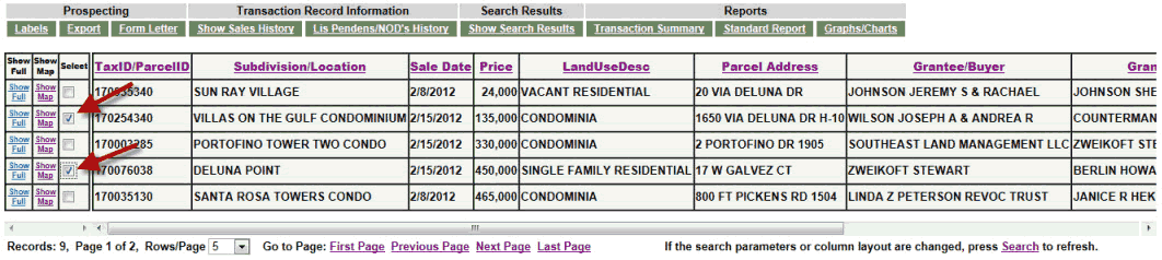 Individual records may be selected by clicking in the check box. If any record(s) is selected, then only this will be used for output such as reports or mailing labels. If you do not select individual records, the system assumes you want to use ALL records in Grid-View for output of reports, mailing labels, etc. NOTE: The Select checkbox can only be used on multiple records if they display on the same page in Grid-View. If your selected records display across multiple page in Grid-View you will need to increase the Number of Records Displayed or refine your search criteria to reduce the search results per page. |