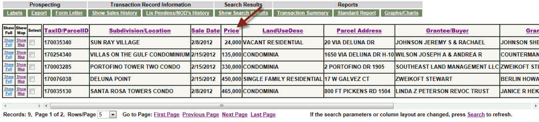 | The search results can be sorted by any column displayed in Grid-View by simply clicking on the column header. The first click sorts the results in ascending order. The second click sorts the results in descending order. In the screen below the records have been sorted by Price in ascending order. NOTE: clicking the column header sorts ALL records in the search results data base, not just the records currently displayed on-screen. | ||