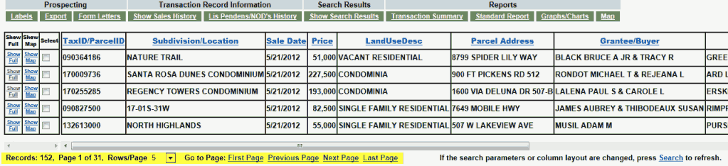 | The total number of records found matching your search criteria displays on the bottom-left of grid-view. The number of pages required to display your search results in grid-view is based on the number of Rows/Page you choose. This user-defined number can be changed from the drop down menu. The default number of Rows/Page is based on your preference setting from the Main Menu. | ||